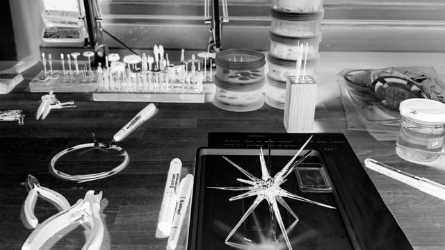 ZDENĚK VACEK OFFERS TWO LEVELS IN THE JITKA – PUK – 3D – UPM PROJECT: THE FIRST IS INFORMATIVE, THE SECOND PURELY VISUAL. IT IS THUS PARTLY AN ENDEAVOUR TO DOCUMENT THE CRAFT AND PARTLY AN OPTICAL EXPLOSION. THE CENTRAL THEME OF THE CONCEPT REVOLVES AROUND THE JEWELLER’S MOTHER JITKA, WHO IS ALSO HIS COLLEAGUE AND AN EXPERT IN THE SPOT MICRO-WELDING TECHNIQUE. JITKA USES A PUK 3 WELDER UNDER A MICROSCOPE IN A PROTECTIVE ATMOSPHERE AND HAS BEEN DEVELOPING HER PRECISE SKILL FOR MORE THAN EIGHT YEARS, GRADUALLY WORKING HER WAY TOWARDS PERFECTION. IT WAS ACTUALLY A MICRO WELDER TO WHICH ZDENĚK VACEK SHIFTED HIS OWN TECHNIQUE MANY YEARS AGO, MOVING FROM THE USE OF FISHING LINE TO USING DENTAL WIRES TO CONNECT INDIVIDUAL PARTS. AFTER A FEW YEARS, HE HAD DEVELOPED THIS PROCESS TO A FORM WHERE HE CREATES RIVETS FROM GOLD AND DECORATES THEIR SURFACE WITH SMALL GEMSTONES.